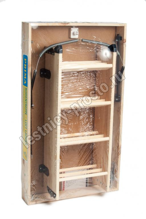 Термоизоляционная крышка типа "сэндвич", толщиной 30 мм, облицована с двух сторон ДCП древесного цвета. Короб люка с уплотнителем. Все металлические элементы лестницы покрашены порошковой краской, ступени лестницы имеют антискользящие насечки и закреплены в столярное соединение «ласточкин хвост», что позволяет выдерживать нагрузку 150 кг. Деревянный стержень для открывания лестницы в комплекте. Две последние секции разобраны. С помощью дополнительной секции высоту лестницы можно увеличить на 55 см.