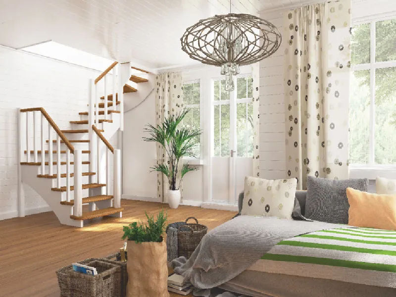 Удобная поворотная лестница на второй этаж. Дополнительные ограждения по первому маршу обеспечивают безопасность при подъеме и спуске, кроме того, небольшой угол подъема открывает всю площадь ступеней. Монтаж осуществляется силами двух человек на объекте по указаниям, приведенным в паспорте на лестницу.