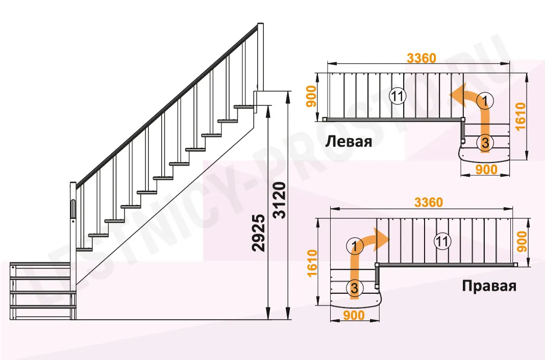 Базовая комплектация включает в себя элементы лестницы и ограждения без какого-либо покрытия. Ограждение можно заменить на любое по вашему вкусу (итоговая стоимость изменится).