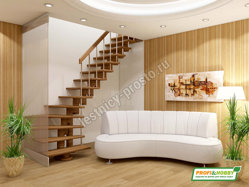 Современная лестница с "воздушным" дизайном. Смотрится легко и благородно, благодаря конструкции на больцах. Хороша при установке к стене, компактна.