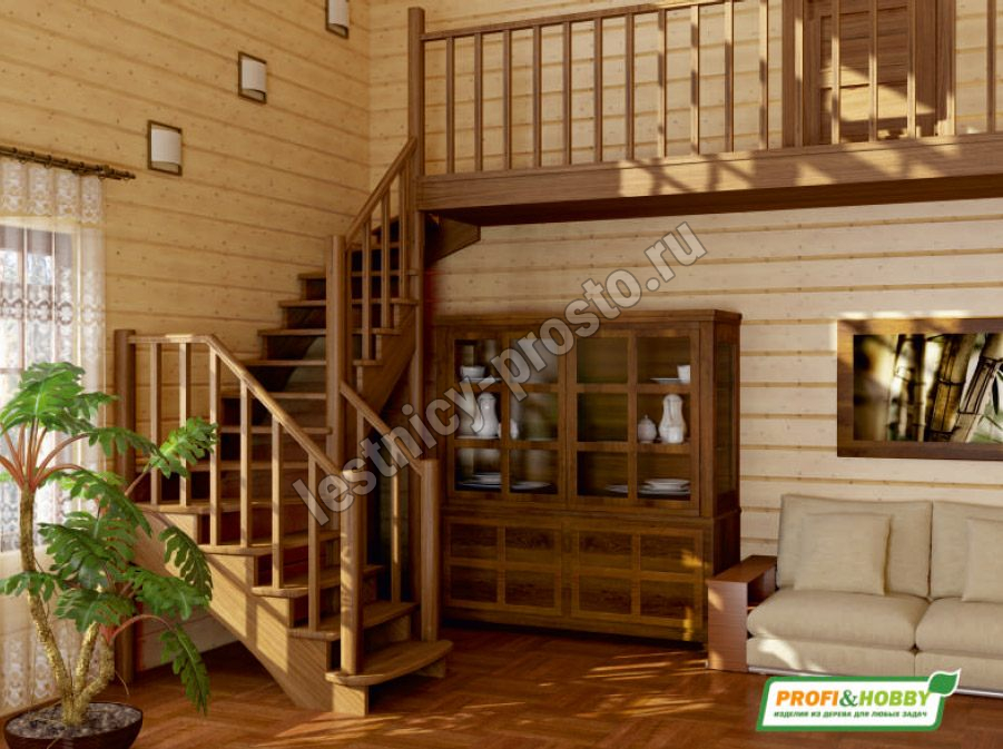 Ступени и поручень лестницы выполнены из дуба, остальные элементы из сосны.
