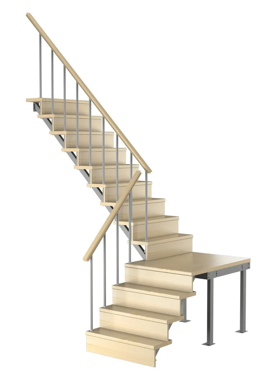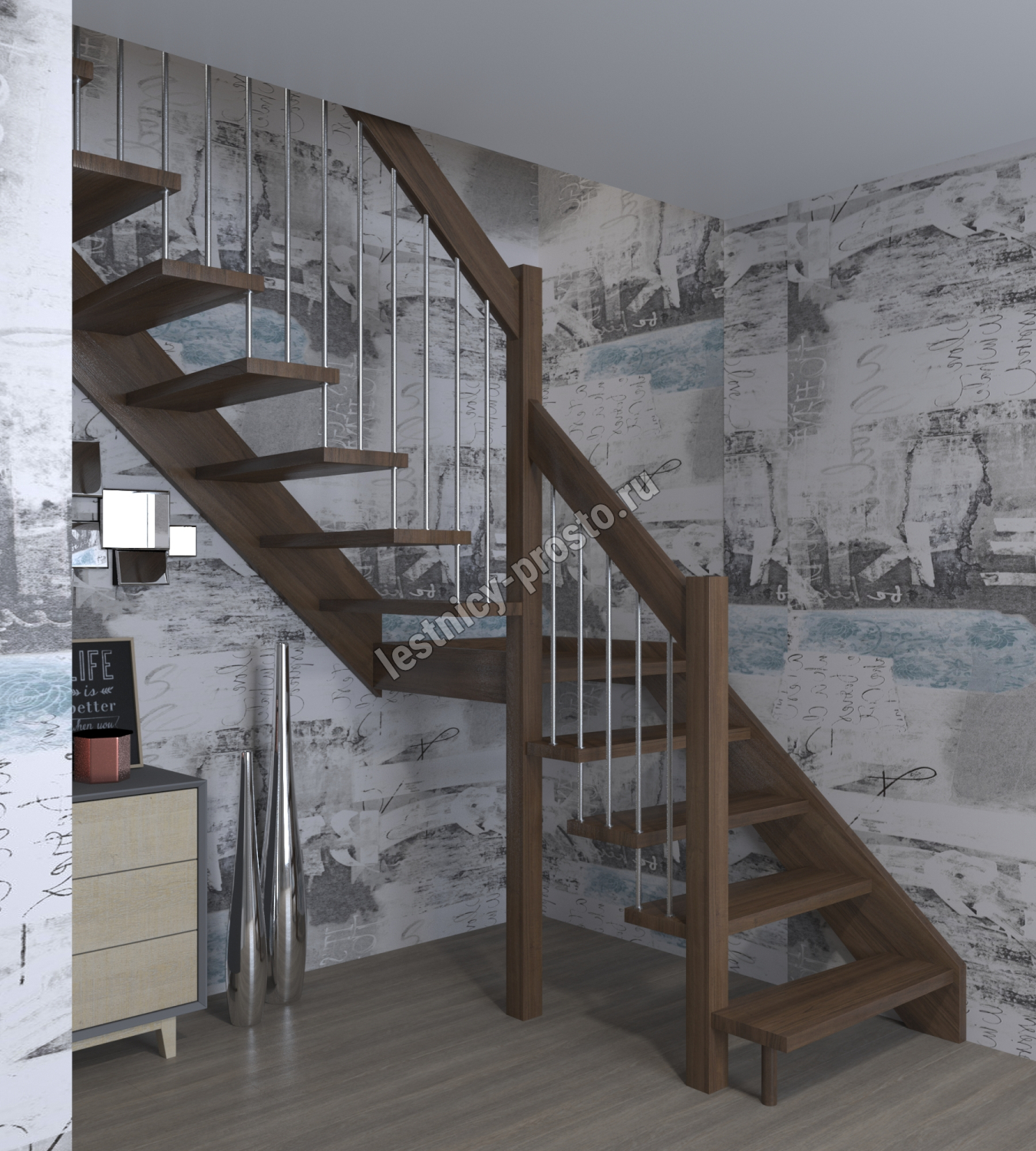 Вид лестницы по реализации поворота: с поворотом на 90° через площадку, с поворотом на 90° через 4 забежные ступени;
