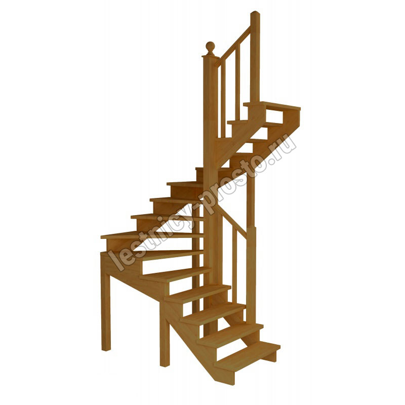 Лестница изготавливается под заказ. Возможны варианты подходящие под необходимые размеры проёма и высоту помещения. Базовое ограждение можно заменить на кованое или точеное. Лестницу можно дополнить подступенями, бортиками, миниподступенями. Первую ступень можно заменить на пригласительную - лекальную. Классическая модель поворотной лестницы раскрывает всю природную красоту натуральных материалов. У лестницы комфортная высота шага, удобный широкий марш и угол подъема. Указана стоимость лестницы без какого-либо покрытия.