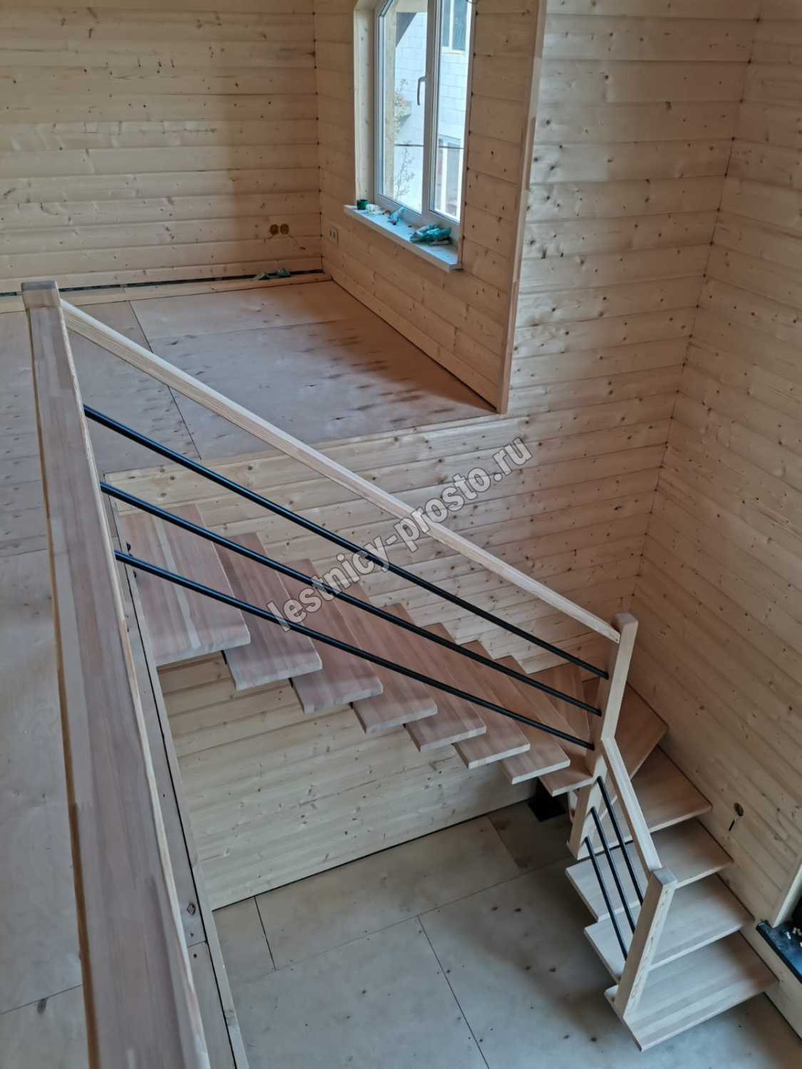Лестница PROSTO MONO STEP TRINITY г-образная забежная, ступени бук, с ограждением