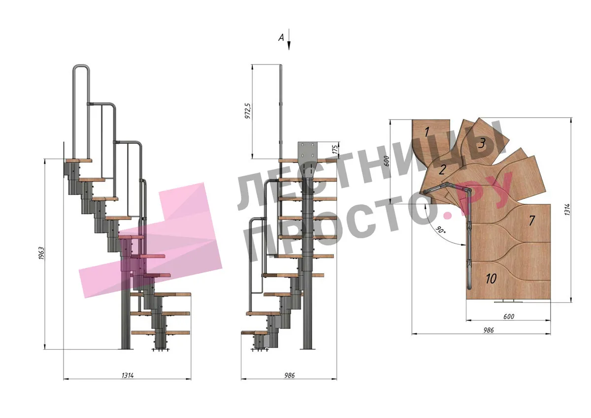 Лестница Prosto Urban White гусиный шаг 600 мм, h180-264 см (10 ступеней), бук