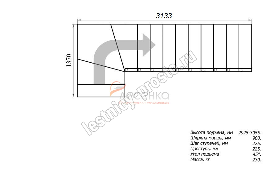 Модульная лестница Фаворит 225 2925-3055, Белый, Сосна, Нержавеющая сталь