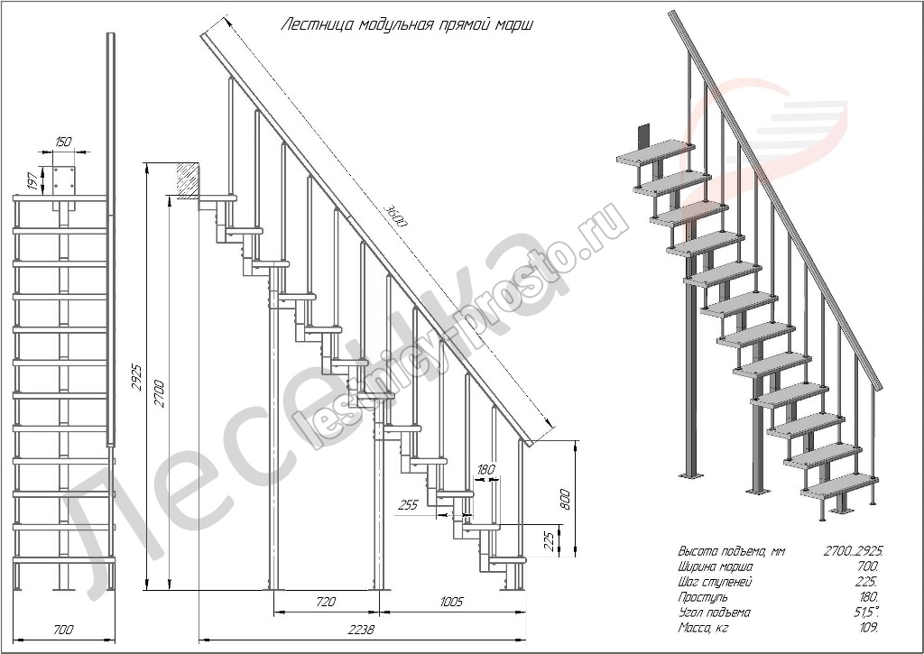 Модульная малогабаритная лестница Линия 2700-2925, Серый, Сосна, Нержавеющая сталь