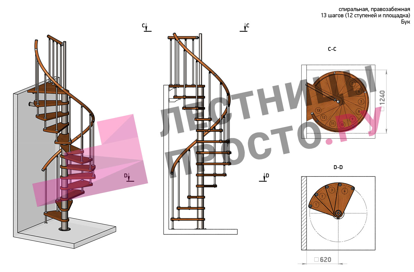 Винтовая лестница Prosto Spiral Black D120см, h282.2-326,3 см, бук